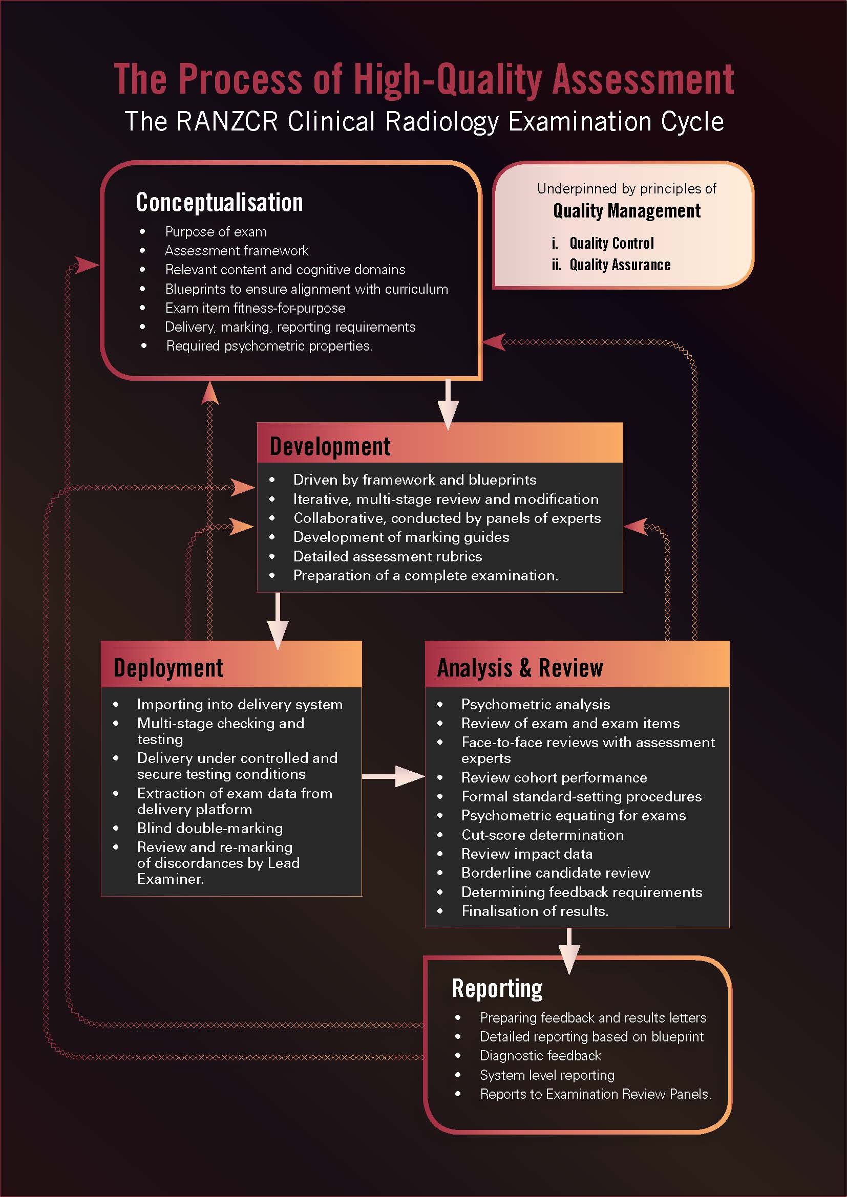 Underpinning the College’s examinations are two principles of quality management: quality control and quality assurance. ACER assessment experts work with the RANZCR examination panels to ensure that appropriate processes are followed, documented and reviewed. This helps to ensure the examination processes are consistent, transparent, fair and ultimately defensible.