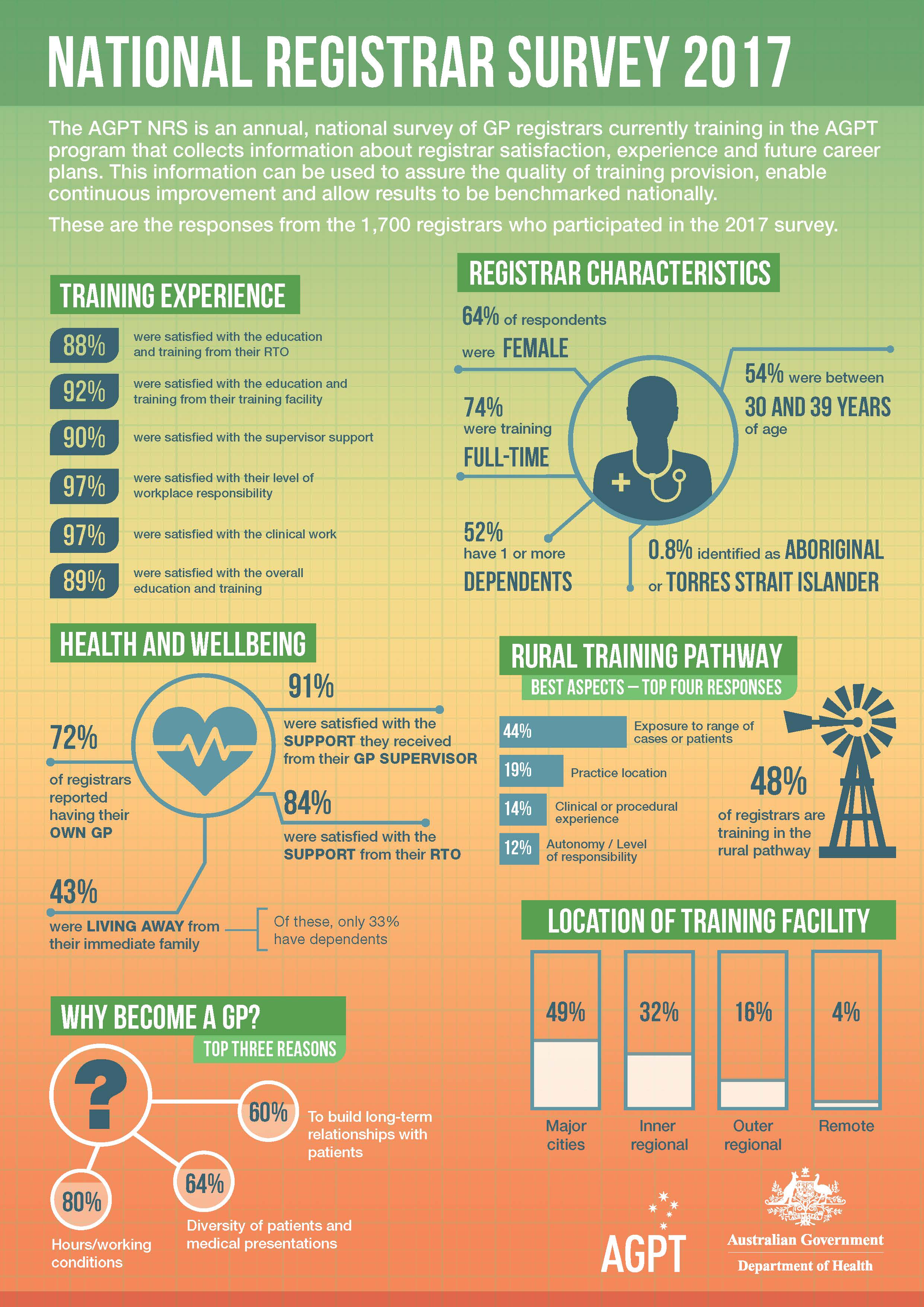 The Department of Health uses the results of the AGPT NRS to monitor satisfaction with the vocational training delivered by its RTOs, and to ensure that training continues to be educationally relevant and fit for purpose, and that it meets the specialist medical training standards determined by the Australian Medical Council.